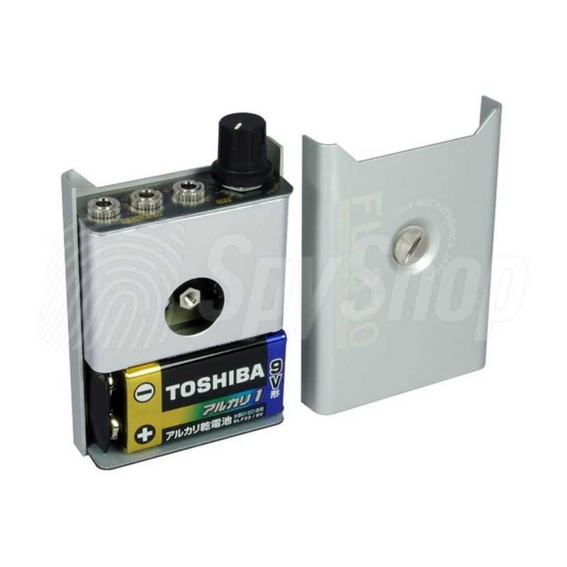 Подслушивающее устройство через стены FL-330 характеризуется прочной конструкцией, простой эксплуатацией и, прежде всего, карманными размерами. Питание осуществляется от сменной батареи 9 В, которая позволяет работать около 50 часов. Для минимизации размера устройство не имеет внутренней памяти, только вход для наушников и цифровой диктофон.